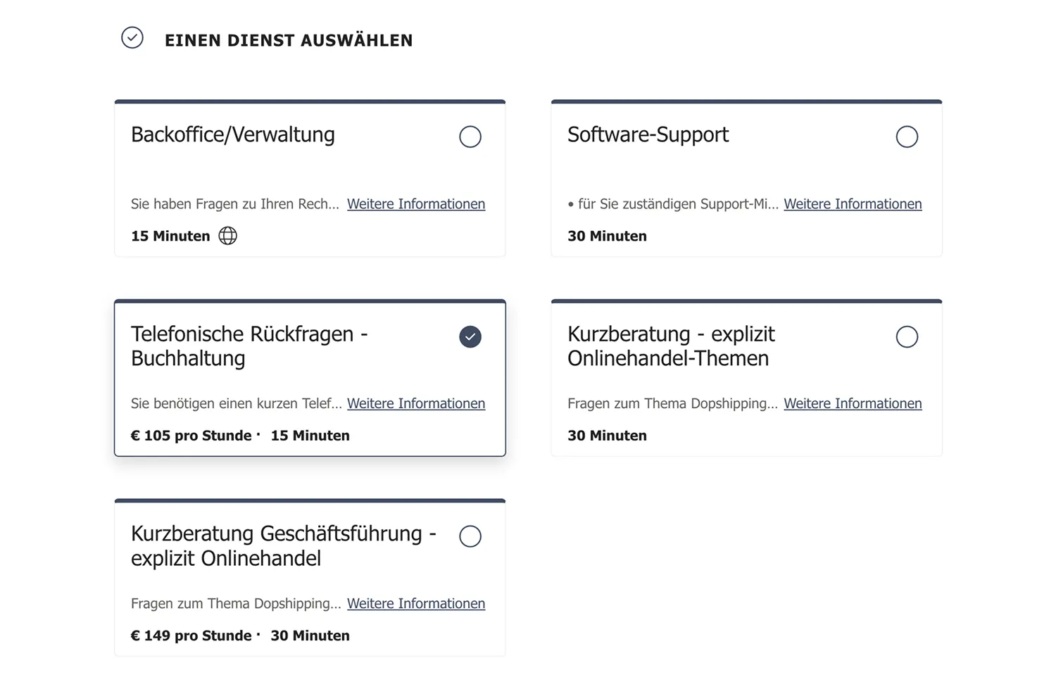 Wähle zunächst die Art des Termins aus. Nähere Informationen zu den verschiedenen Terminarten findest du jeweils auf der Buchungsseite.